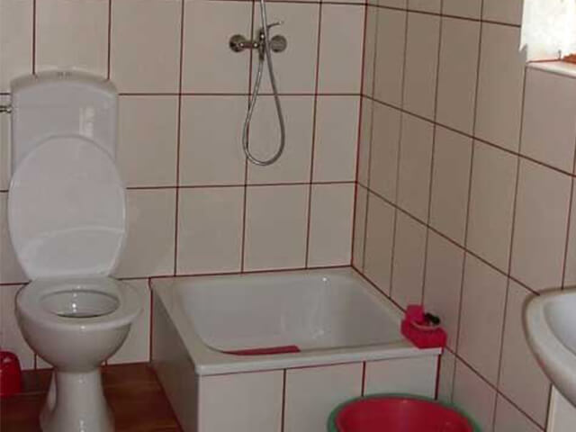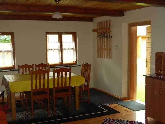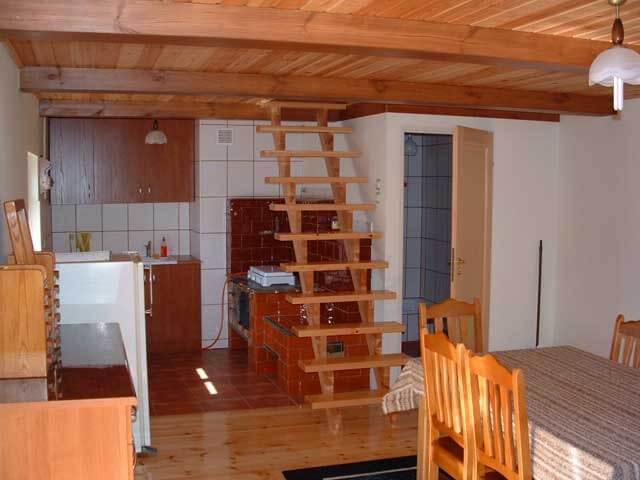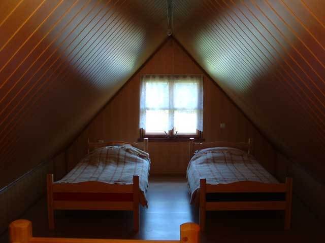 DOM MAŁY kaflowy trzon kuchenny z murkiem i piekarnikiem żeliwnym, duża jadłodajnia, lodówka, TV, łazienka z natryskiem i wc. Na piętrze duża sypialnia dla 4 osób.